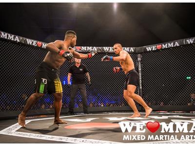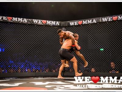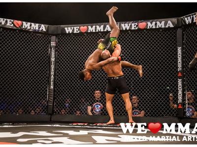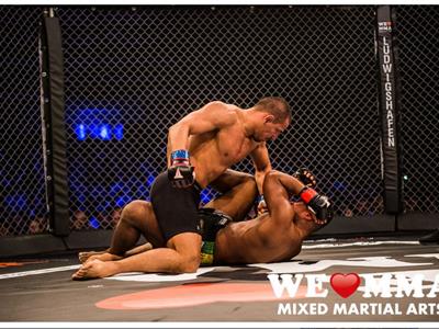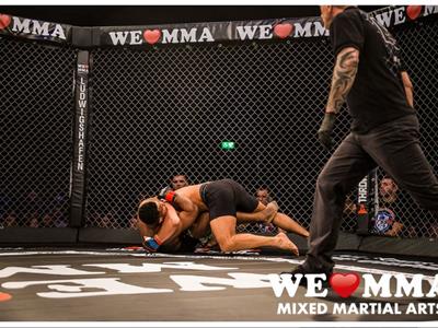 Bundesligaringer Carsten Kopp gibt für das FSS Kampfsportzentrum Rhein-Neckar sein MMA-Debüt bei We love MMA. Dabei überzeugt er mit spektakulären Takedowns und Top Control gegen seinen Gegner aus Ghana und holt sich einen eindeutigen Punktsieg. Gratulation, weiter so!